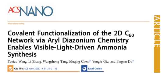 近期,我校邱永福教授团队开发出新型富勒烯功能材料,在光催化氮气还原领域取得重要研究进展,相关成果以“Covalent Functionalization of the 2D C60 Network via Aryl Diazonium Chemistry Enables Visible-Light-Driven Ammonia Synthesis”为题发表在综合性一区TOP期刊《ACS Nano》。该论文九九精品视频一区在线久久久久久久久久毛片精品美女|国产99久久久久久免费看|中文精品99久久国产|国产69精品久久久久9999|精品久久久久久中文字幕无码|亚洲熟妇无码久久精品国产精品99|精品国产天堂综合一区在线为第一单位,中国科学技术大学为合作单位,博士后王涛涛为该论文的第一作者,陈木青研究员和杜平武教授为通讯作者。